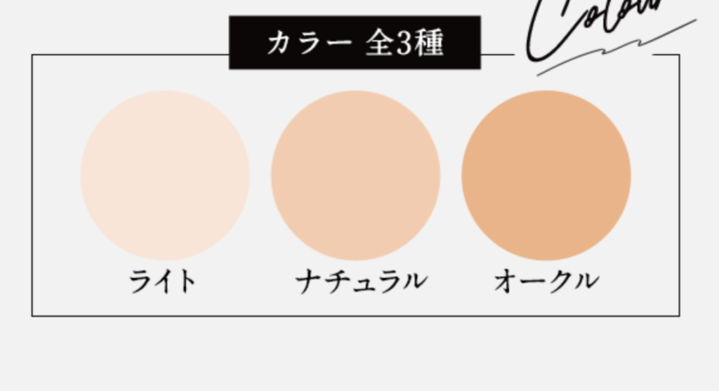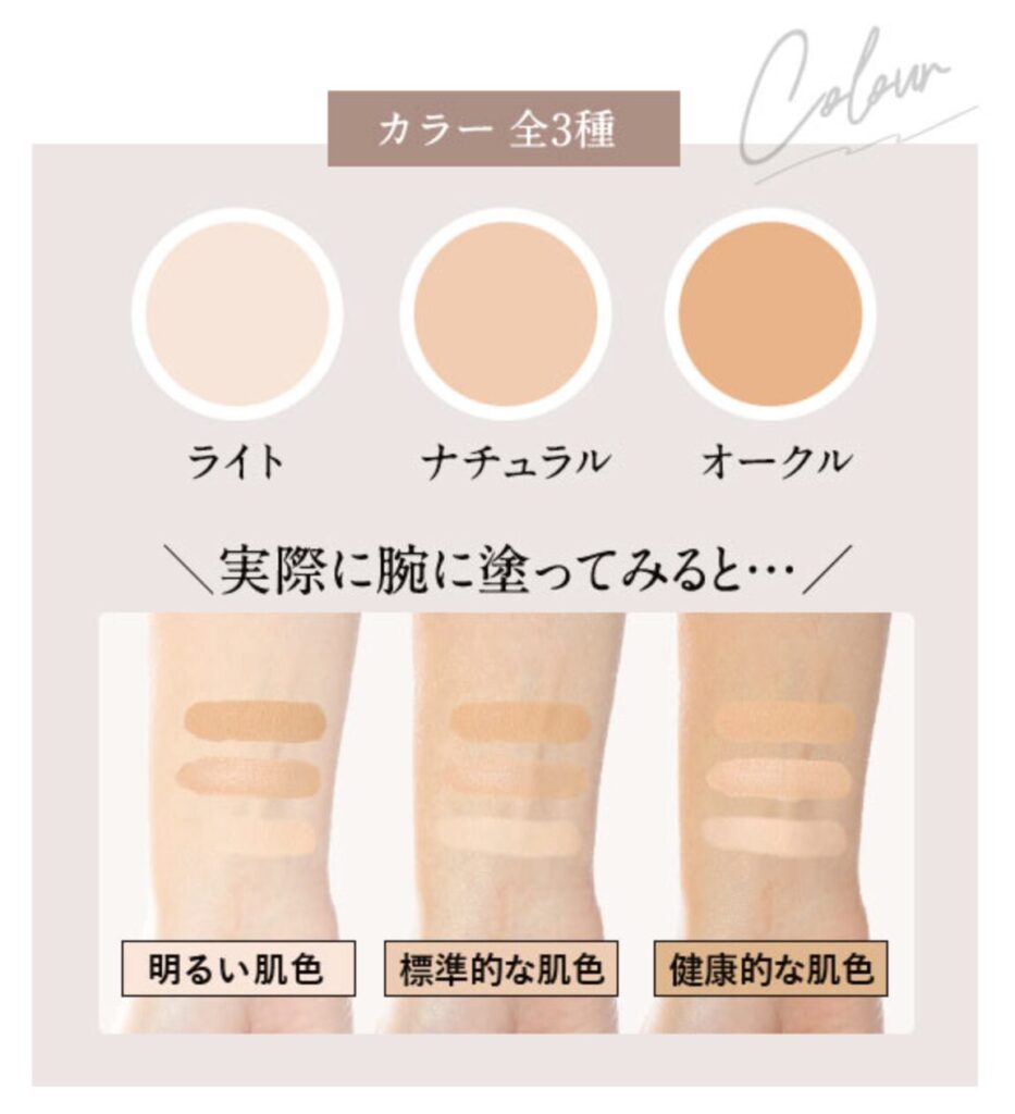 ライト、ナチュラル、オークルの3色展開により、自分の肌トーンに合った色を選ぶことで自然な仕上がりが得られます。